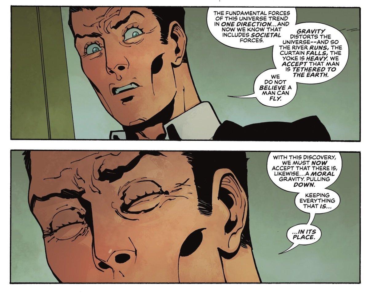 Those that stand in the way of this natural order, he argues, are perpetuating injustice — because, after all, doesn’t the existence of the Omega Particle prove that things are meant to be the way they are? — and therefore those in power have a moral obligation to maintain their power and stand against attempts to change things. “Here in this room — our watchtower, looking down from high above the herd — we can be in league,” he says. “Between us, we can ensure the moral arc of the universe bends towards justice. A toast, then. To an ordered world… and to our Justice League.”