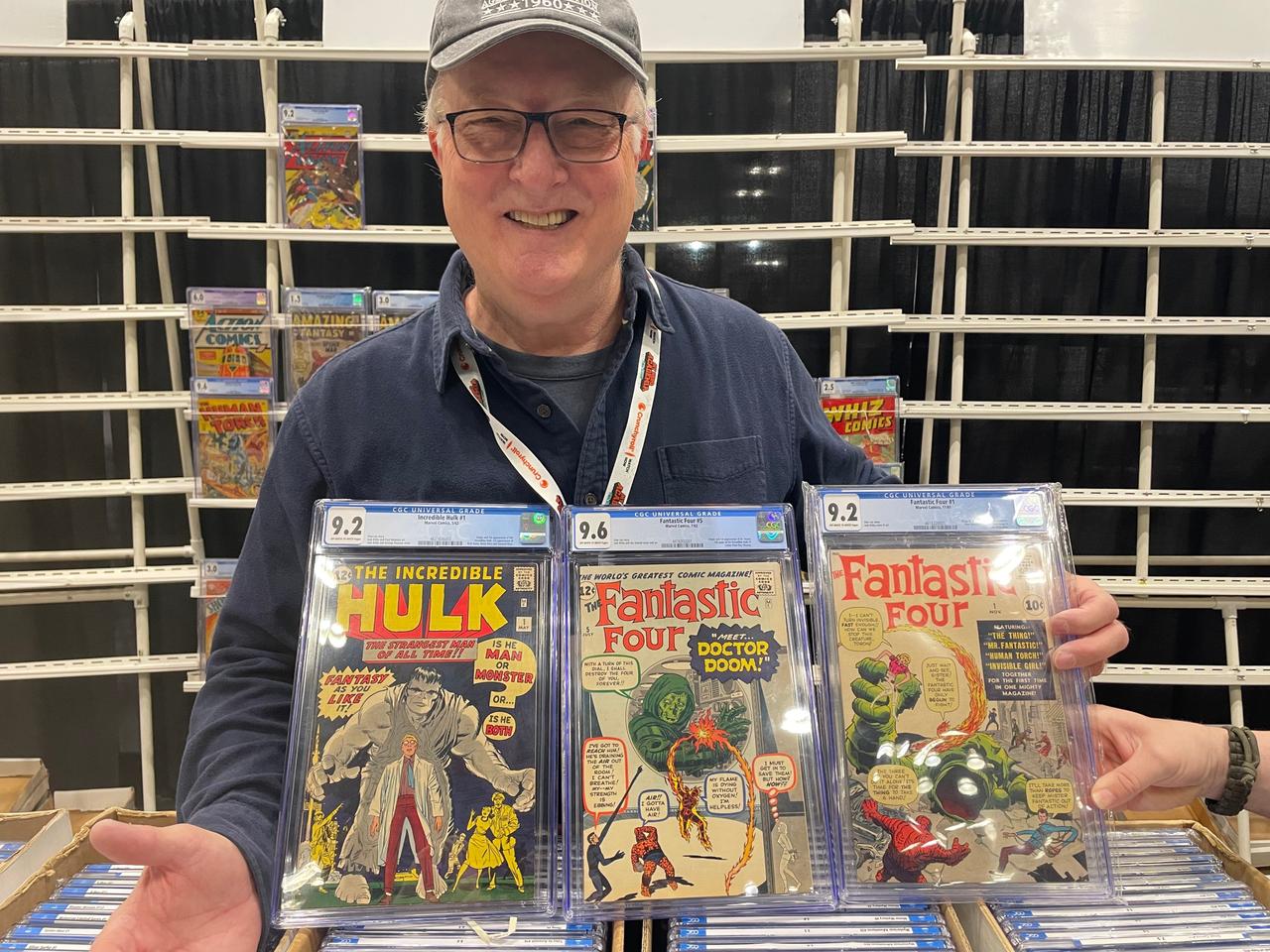 But the retailer with three books whose total price tag is greater than the others combined is High Grade Comics (booth #3721). High Grade is selling Fantastic Four #5 (CGC 9.6) for $350,000, The Incredible Hulk #1 (CGC 9.2) for $950,000, and a 1961 Fantastic Four #1 (CGC 9.2) for a million dollars. Here's High Grade's Robert C. Storms with all three.