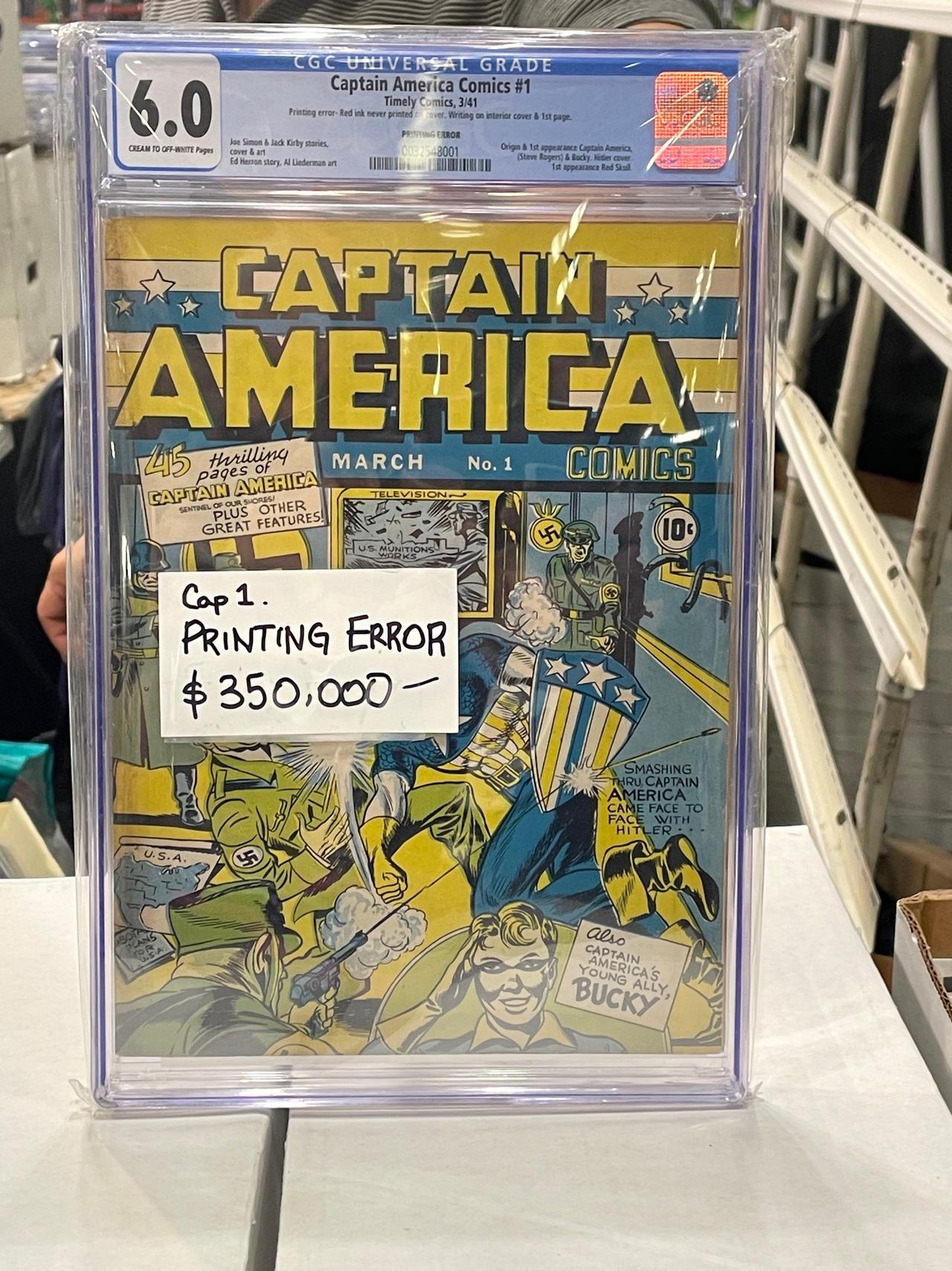 Take for instance Harley Yee Rare Comics (booth #3517). They’re selling a misprinted 1941 Captain America #1 (CGC 6.0) for $350,000. Somehow, a few copies of this legendary first issue by Joe Simon and Jack Kirby were printed without the color red. Come and see the First Avenger salute the yellow, white, and blue!