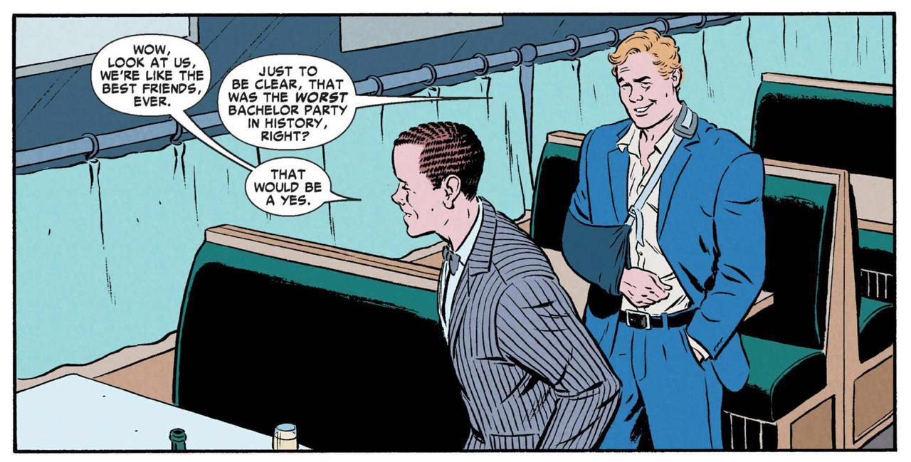 Amazing Spider-Man #638, which revisits the events of the wedding, contains a flashback where Flash Thompson reflects on the shindig. “Just to be clear, that was the worst bachelor party in history, right,” Flash asks Harry. “That would be a yes,” Harry replies.
