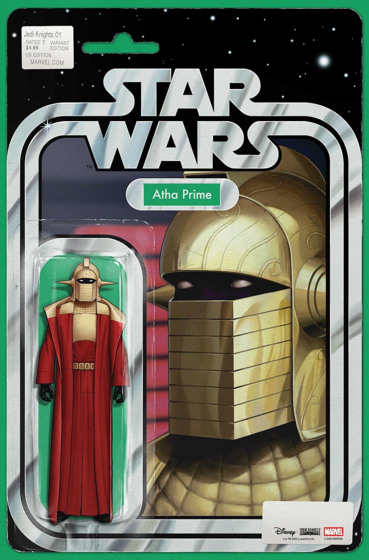 The series — set in a period before The Phantom Menace, and featuring Jedi including Yoda, Obi-Wan Kenobi, and Qui-Gon Jinn — will launch March 5, written by Guggenheim with art from Madibek Musabekov. Atha Prime will feature on a variant cover to the first issue by John Tyler Christopher, imagining the character’s action figure had it actually been produced; you can see the full cover below.