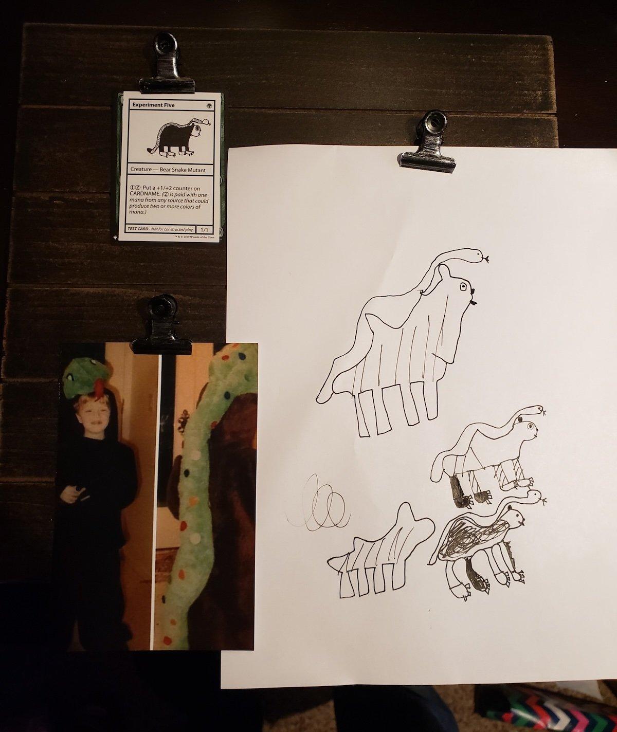 “There's this Magic set I'm working on called Mystery Booster. It has these 121 playtest cards — cards that look like they're handdrawn cards, with wild abilities and names - and I'm leading the design of them. It's a project that I poured many, many days of effort into. It took a ton of effort to get this thing made. It was a product I had a vision for, and worked to bring to life from start to finish,” he explained. “I put a little something in there that was personal. Something special. I created Magic's first, and only, Bear Snake. And to really make it more incredible... I got to draw the ridiculous sketch artwork too. Truly an amalgamation of my life so far.”