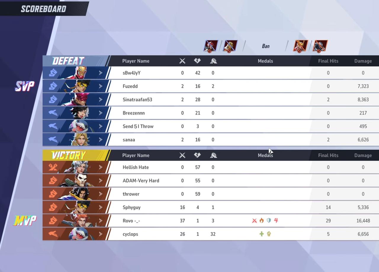 The heart symbol in the middle signifies the number of times that a player got knocked out in the match, while the crossed weapons symbol to the left of it is the number of times that the player knocked out an opponent. It goes without saying that it's not normal for a competitive Marvel Rivals player to get KO'd more than 20 times in a match, much less upwards of 50, and if you watch the match's replay, it's obvious that there are multiple players on each time throwing from the get-go by jumping off ledges to their deaths (the replay ID is 10369680696 in case you want to see for yourself). There's also the fact that some of the players in the match are literally called "thrower" and "send 5 I throw," along with names meant to sound like practice AI bots like "Adam-Very Hard."
