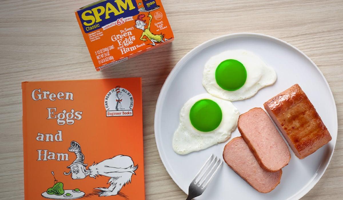 Dr. Seuss and Spam are collaborating to make co-branded dreams come true for the 65th anniversary of Green Eggs & Ham