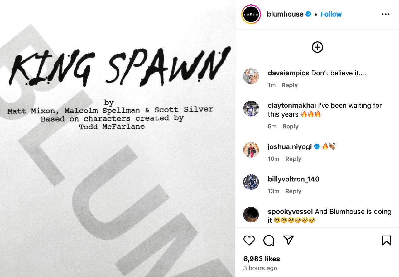 The announcement showed up on both McFarlane's and Blumhouse's official Twitter accounts on July 22. In the identical posts, one can see the title page of the King Spawn script along with its now official title. Also listed on the post are screenwriters Scott Silver (who wrote 2019's Joker), Malcom Spellman (scribe of Marvel's Falcon and the Winter Soldier), and comic book movie newcomer Matt Mixon. See the post below.