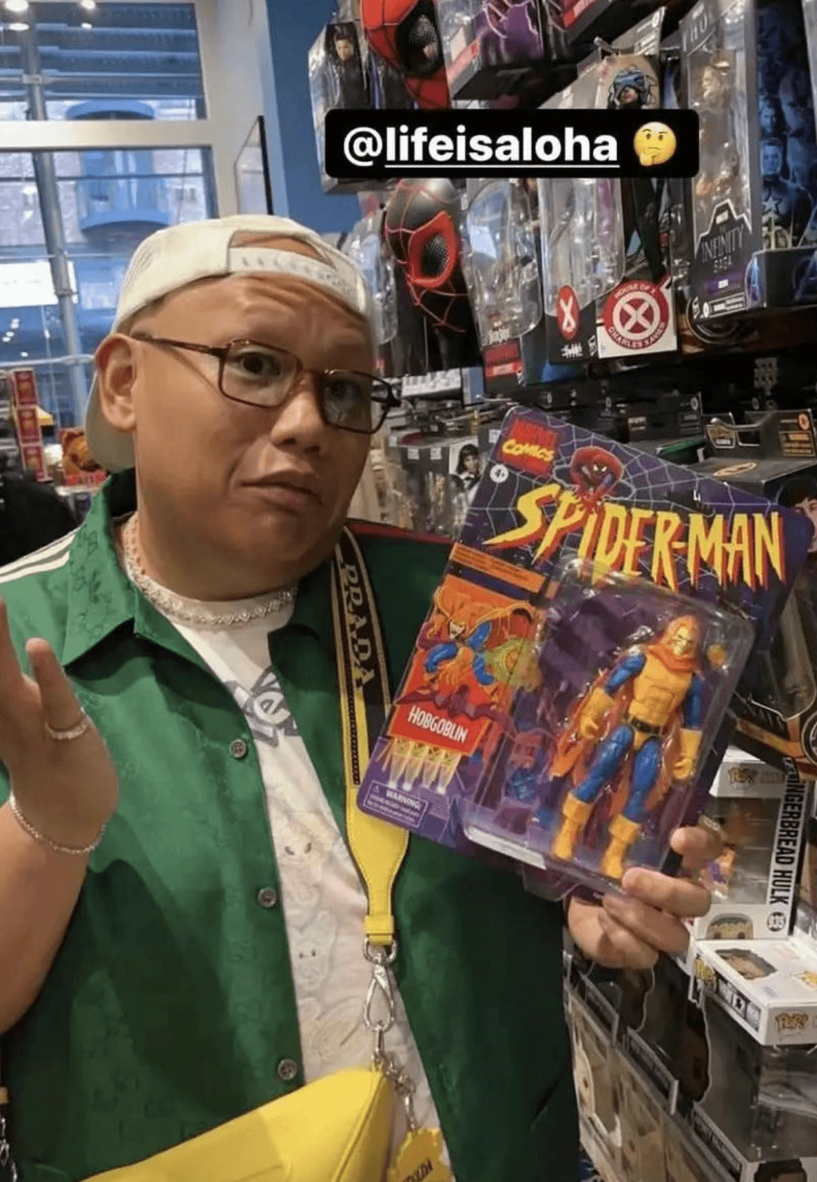 Pictured above is Batalon holding an action figure of Spidey villain the Hobgoblin, particularly, the version of the character that appeared in 1994's Spider-Man: The Animated Series. The Hobgoblin is a villain who took on some of the technology and evil intent of big bad the Green Goblin, and in both the aforementioned animated series and the Marvel Comics that inspired them, his civilian identity is one Ned Leeds.
