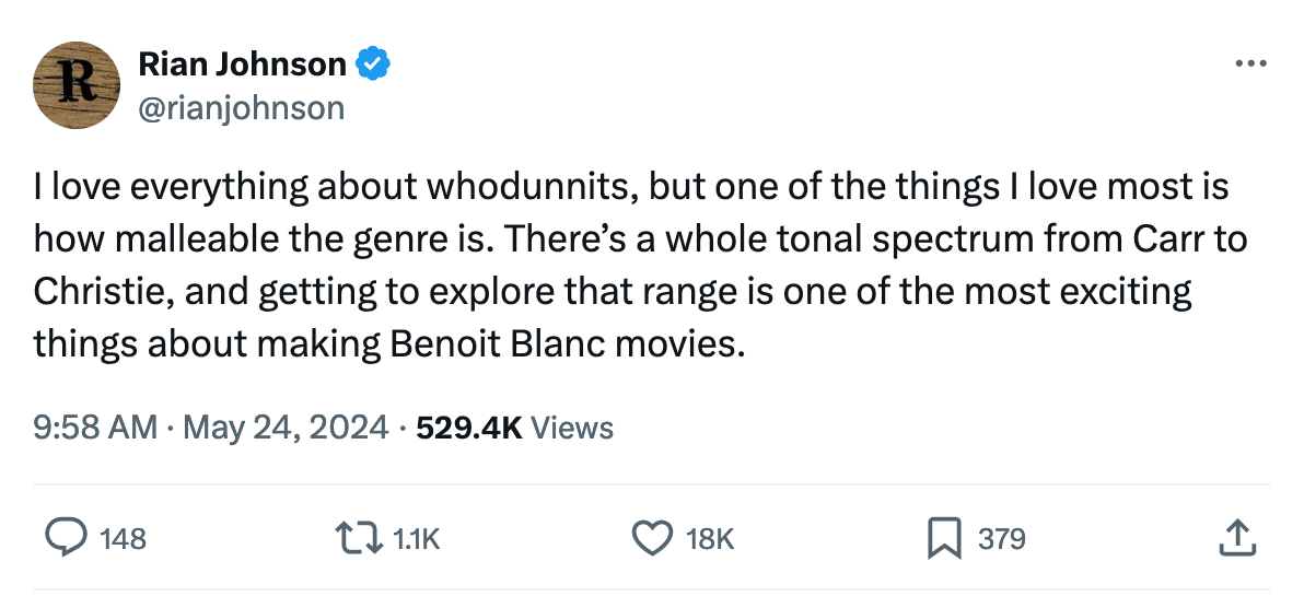 Johnson followed that up with another tweet saying "[...] I’m very, very excited to share the title, which gives a little hint of where it’s going." This, combined with Blanc's assertation in the above teaser that the movie will be his "most dangerous case yet," seems to signal a decidedly darker tone than the previous films.