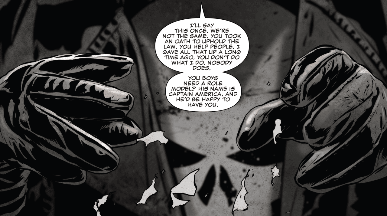 "I'll say this once. We're not the same. You took an oath to uphold the law. You help people. I gave all that up a long time ago. You don't do what I do. Nobody does. You boys need a role model? His name is Captain America, and he'd be happy to have you."