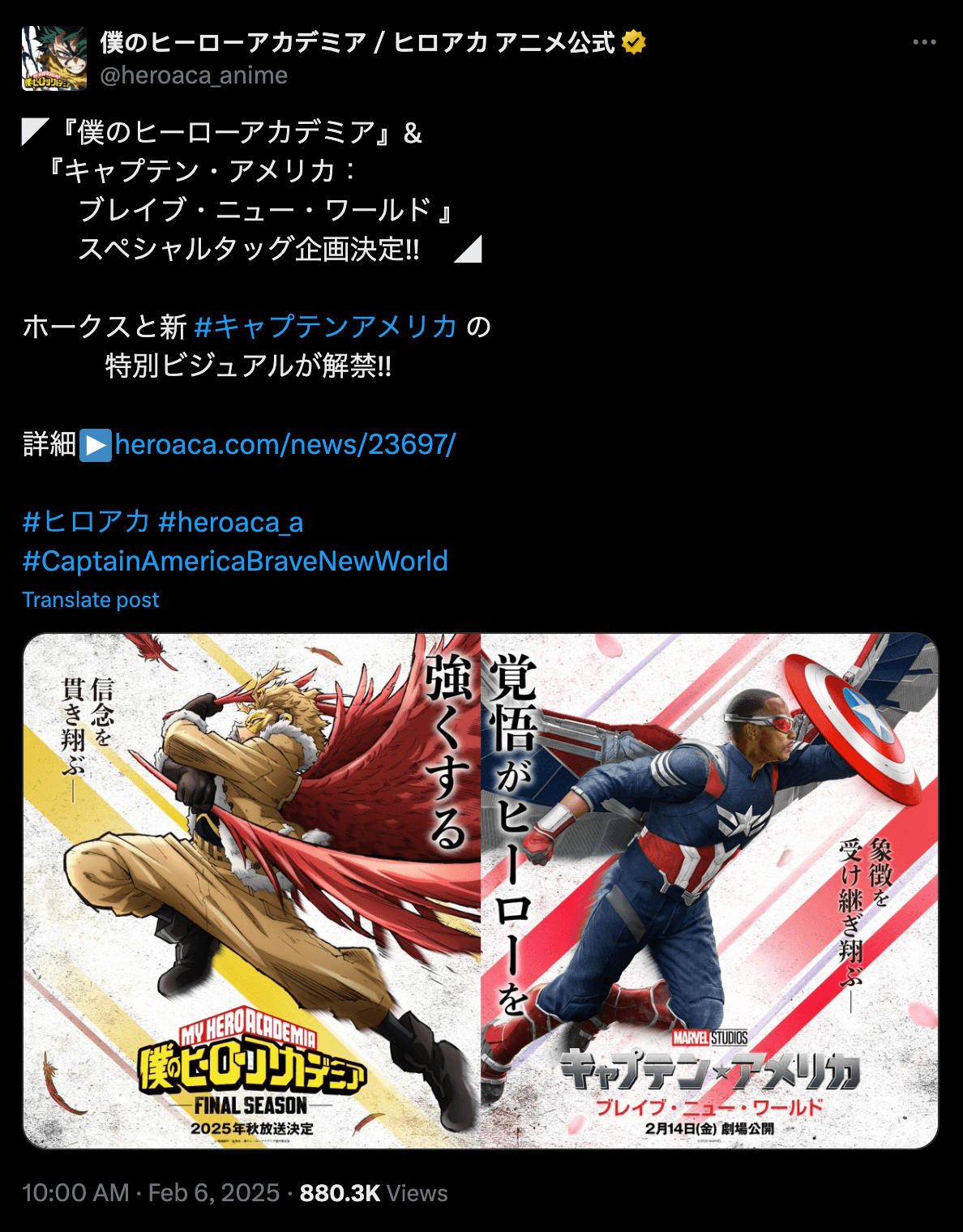 (In case you're wondering, the Japanese text reads: My Hero Academia & Captain America: Brave New World Special tag team project!!)
