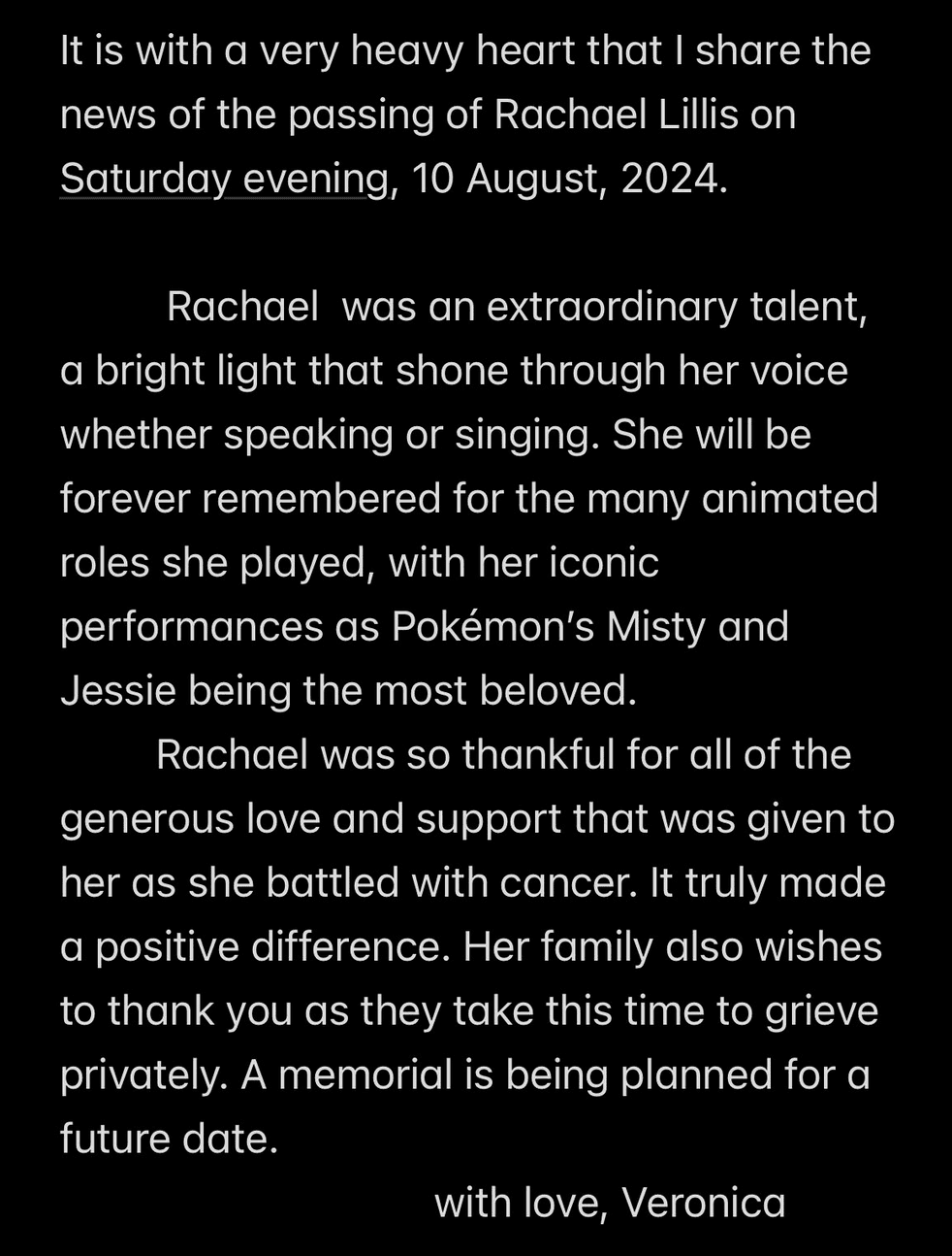 In May of 2024, Lillis was diagnosed with breast cancer. On August 12, Lillis's costar Veronica Taylor, who played opposite her as Ash Ketchum, announced her passing on X/Twitter. The post is pictured below.