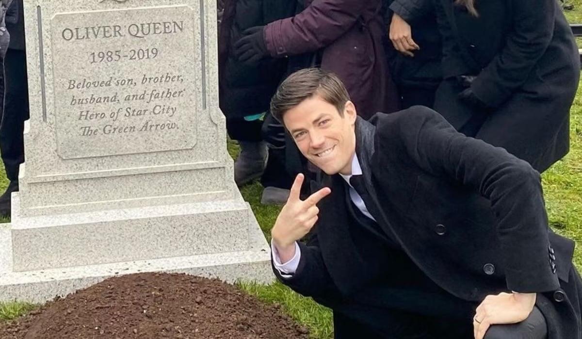 The Flash's Grant Gustin said the meme of him posing by Green Arrow's grave will end up on his own tombstone